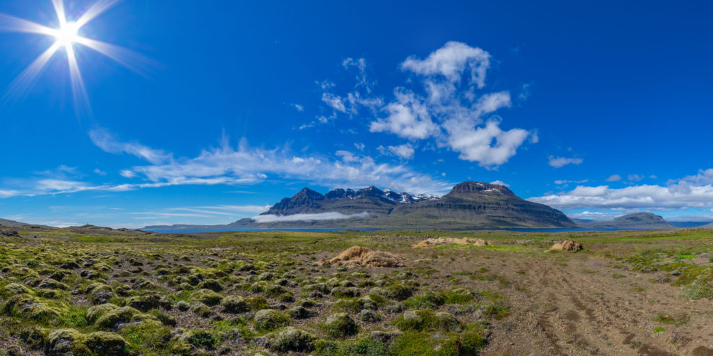 Auch der pyramidenförmige über 900 m hohe Gipfel Búlandstindur auf dem Westufer verdankt seine Form Feuer und Eis. Zu seinen Füßen liegt am sog. Teigarhorn eine bedeutende Fundstelle des Minerals Calcit, auch „Islandspat“ genannt, das in der Optik für seine doppelte Lichtbrechung bekannt ist und aus diesem Grund hier abgebaut wurde. Der Ort steht unter Naturschutz.