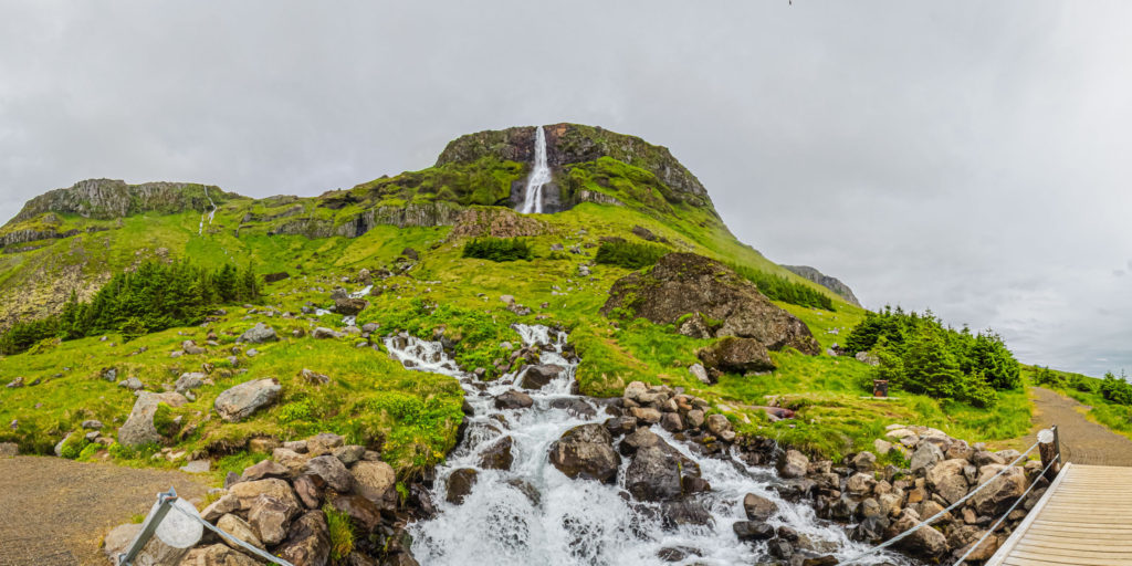 Der 79 Meter hohe Bjarnarfoss ist der bekannteste Wasserfall an der Südküste von Snæfellsnes. Im Jahresdurchschnitt fällt hier etwa ein Kubikmeter Wasser pro Sekunde in die Tiefe. Zu Zeiten der Schneeschmelze können es aber auch deutlich größere Wassermengen sein. Wenn der Wind stark von Süden weht, kommt manchmal kaum etwas von dem Wasser am Boden an, sondern wird von den Winden die Felswand wieder hinaufgeblasen.