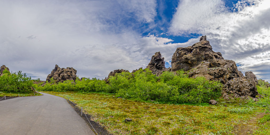 Die bizarr geformten Steinformationen des Lavafelds erinnern an verfallene Ruinen von Burgen und Türmen. In der isländischen Mythologie wird Dimmuborgir als Unterkunftsort von Elfen und Trollen gesehen.