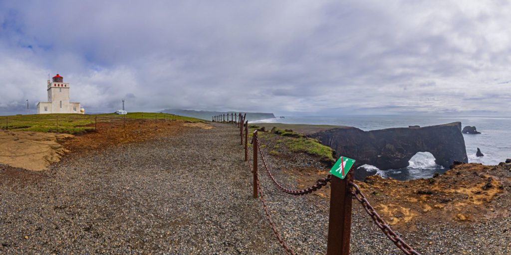 Vom Kap Dyrhólaey hat man eine hervorragende Aussicht über das Meer und auf den Mýrdalsjökull. Nach Osten hin sieht man die Reynisdrangar, die schwarzen Felsnadeln vor Vík, nach Westen hat man bei guter Wetterlage einen weiten Blick entlang der Südküste.