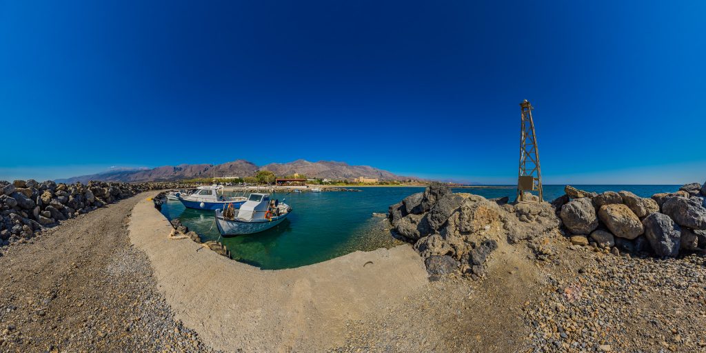 Der Strand von Frangokastello liegt unterhalb der Festung auf einer vorgelagerten Halbinsel. Die westlich anschließende Lagune bildet ein natürliches Hafenbecken für die dort liegenden Fischerboote. Der Strand aus feinem hellen Sand fällt flach ins Meer ab. Er ist in der Saison stark besucht. Vor dem Kastell am Strand gibt es eine Taverne mit Andenken-Verkauf. Auch Liegen und Sonnenschirme werden verliehen.