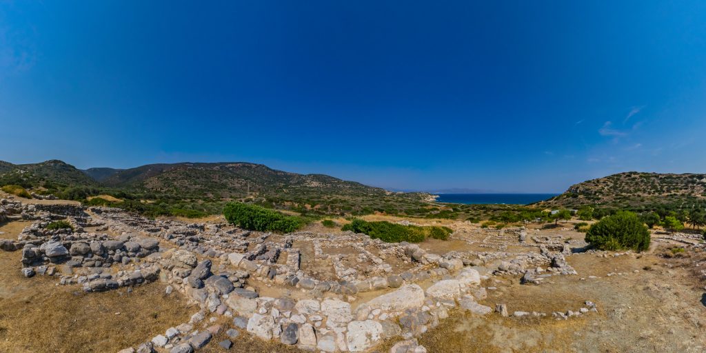Die minoische Stadt Gournia liegt auf einem leicht ansteigenden Hügel an der schmalsten Stelle Ostkretas. Auch wenn es auf den ersten Blick nicht so erscheint – Gourniá ist die einzige vollständig freigelegte minoische Stadt auf Kreta. Paläste wie Festos und Knossos sind nur zu einem Bruchteil freigelegt. Die Ausgrabungen von Gournia umfassen ein Areal von fast 15.000 m2. Man spaziert quasi über ein Feld von Steinen und braucht schon etwas Fantasie und Vorstellungskraft, um sich anhand der Grundmauern die einstige Stadt vorstellen zu können. Aber genau diese Unberührtheit, das heißt der fehlende Versuch einer modernen Restauration, macht den Reiz der Ausgrabungen von Gournia aus.