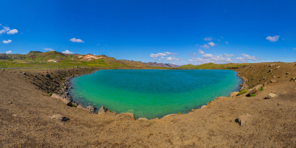 In einem Explosionskrater des Vulkansystems Krýsuvik hat sich der türkisgrüne See Grænavatn gebildet. Die Färbung entsteht durch eine Kombination aus Mineralen und Wärme liebender Algen. der Krater befindet sich an der Straße 42 südlich des Kleifarvatn.
