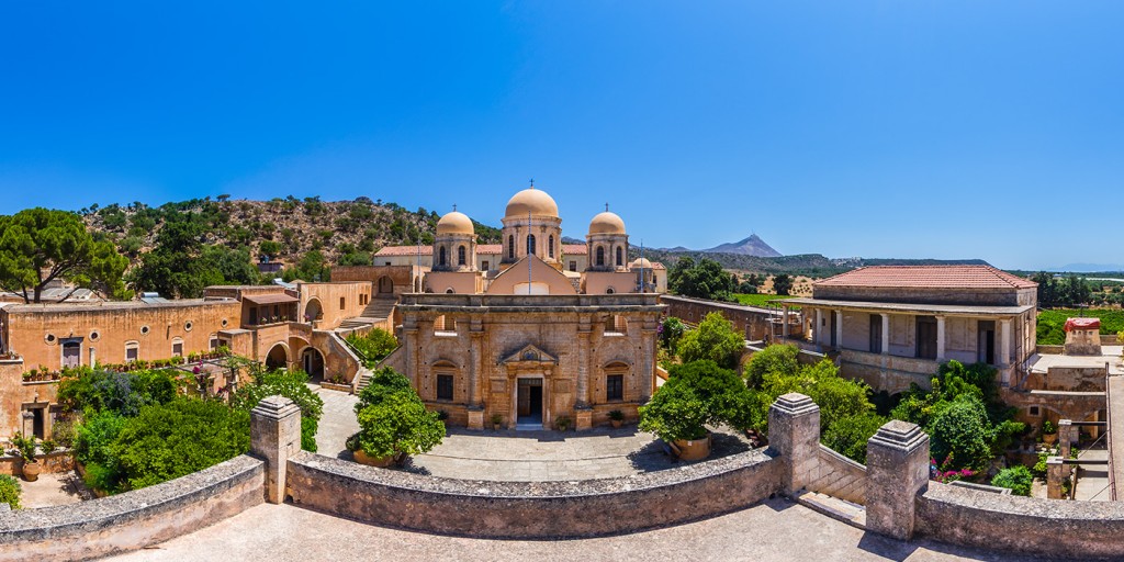 Moni Agia Triada (auch Agios Triados Tsangarolon) wurde 1631 am südlichen Rand des nordöstlichen Gebirgszuges von Akrotiri erbaut. Es ist eine der heiligen Dreifaltigkeit geweihte Gründung zweier venezianischer Mönche, die der orthodoxen Kirche beigetreten waren, den Brüdern Giancarolo (Zangarola). Sie renovierten ein älteres Kloster, das ihnen von einer Familie Mourtari geschenkt worden war. Die in Oliven- und Orangenhaine eingebetteten Gebäude sind in venezianischem Renaissance-Stil errichtet. Sie wurden im Jahre 1830 wieder aufgebaut, nachdem das Kloster 1821 durch die herrschenden Türken niedergebrannt wurde. Moni Agia Triada untersteht direkt dem Patriarchat von Konstantinopel.