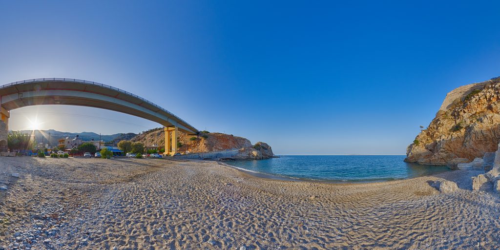 Im Osten des Strandes gibt es ein riesiger Kalksteinfelsen, auf dessen Spitze einmal Paliokastro, eine venezianische Festung, dominierte, die die Bucht von Heraklion vor feindlichen Angriffen geschützt hatte. Die Burg, von dem ein Teil überlebte, sollauf der Akropolis der antiken Stadt Kytaion gebaut worden sein.