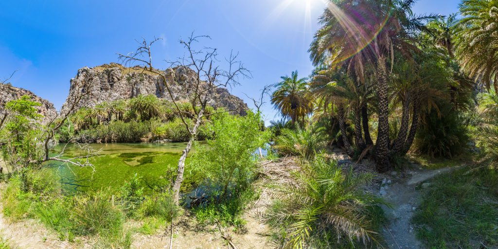 Ab ungefähr 400 Meter vor der Mündung erweitert sich der Megalopotamos zu einem lagunenhaften kleinen See, dem Limni Preveli. Die etwa 15.000 m² große Wasserfläche entstand durch den hier nur noch sehr flachen Verlauf des Baches und ständigen Sandanschwemmungen am Meer, die ihn vor dem Strand anstauen. Die Ufer sind gesäumt von Schilf, blütenreichen Oleanderbüschen, Mastixsträuchern, Eukalyptus und dem die Mündung kennzeichnenden Palmenwald der Kretischen Dattelpalme. Unmittelbar vor dem Meeresufer spenden neben Palmen viele Tamarisken Schatten, unter denen Liegen für die Strandgäste angeboten werden. Der gesamte Bereich ist ein stark bedrohtes Biotop, dessen empfindliche Flora und Fauna dem Massenansturm der Touristen im Sommerhalbjahr kaum noch gewachsen ist.