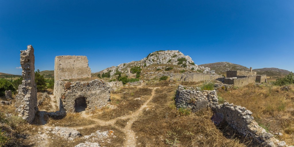 Alles dominierend ist der Wohn- und Wehrturm aus dieser Zeit. Die Dorfkirche „Agios Georgios“ hat eine schöne Wandmalerei zu bieten, auf der über einem mittelalterlichen Grab Maria mit dem Jesuskind zu sehen ist. Auch der schön eingefasste Brunnen an der Südseite des Dorfes ist einen Besuch wert.